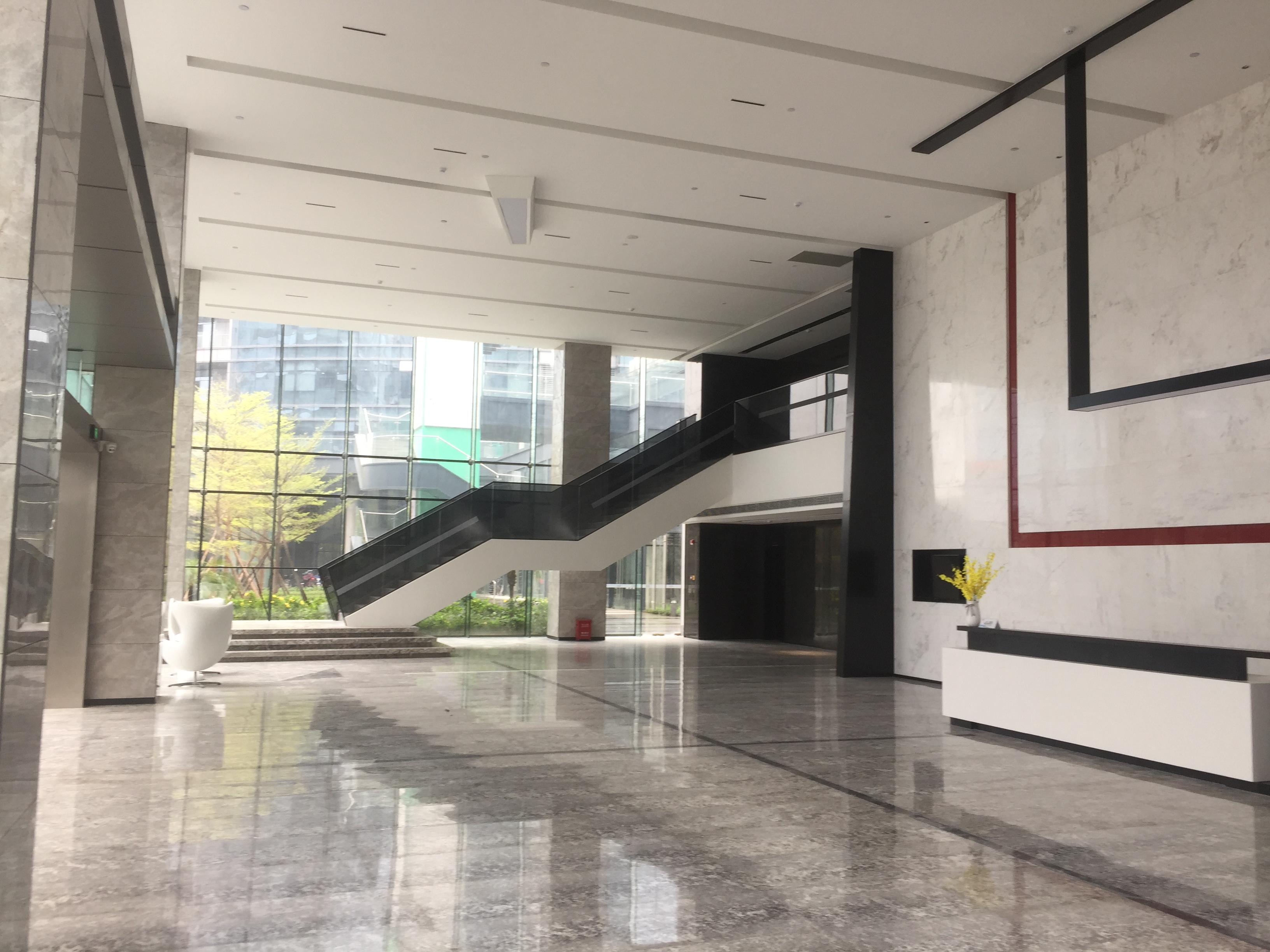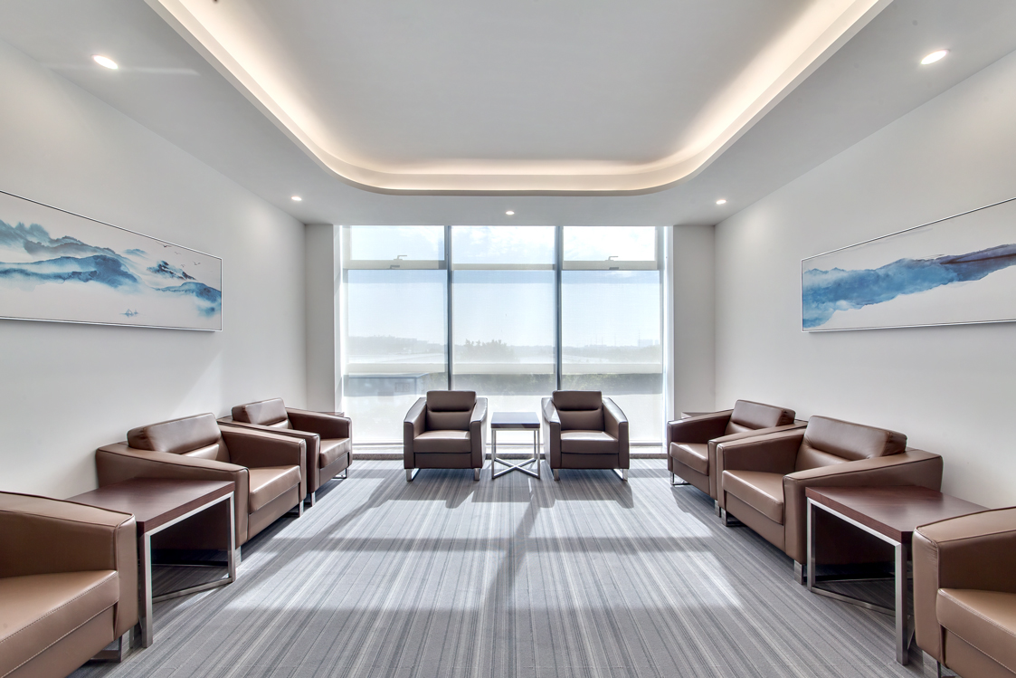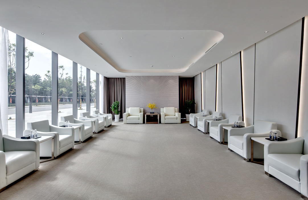 入口辦公前臺區墻面和前臺運用幾何分割設計,簡約的材料遇上瘋狂的切割,便會形成獨特的形態,背景墻白色乳膠漆,前臺是白色石材,地面是灰色條紋地毯。同時銷售中心和辦公室墻面以白色乳膠、水泥板、黑色不銹鋼為主,地面木地板,灰色地毯為主,水吧區域,沙發用顏色去點綴,在空間節奏的變化、自然光影的引入和材料肌理的運用,為至銷售中心和辦公室創造豐富和有趣的觀展體驗。